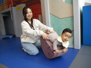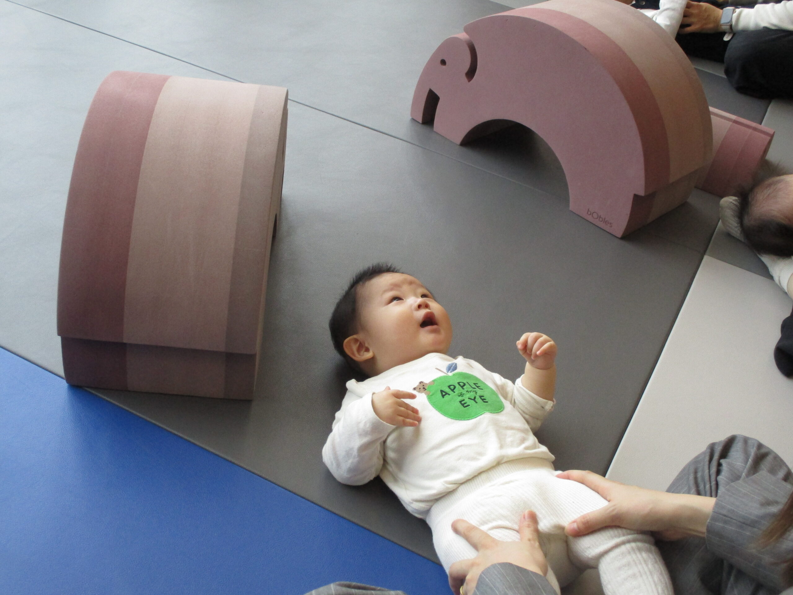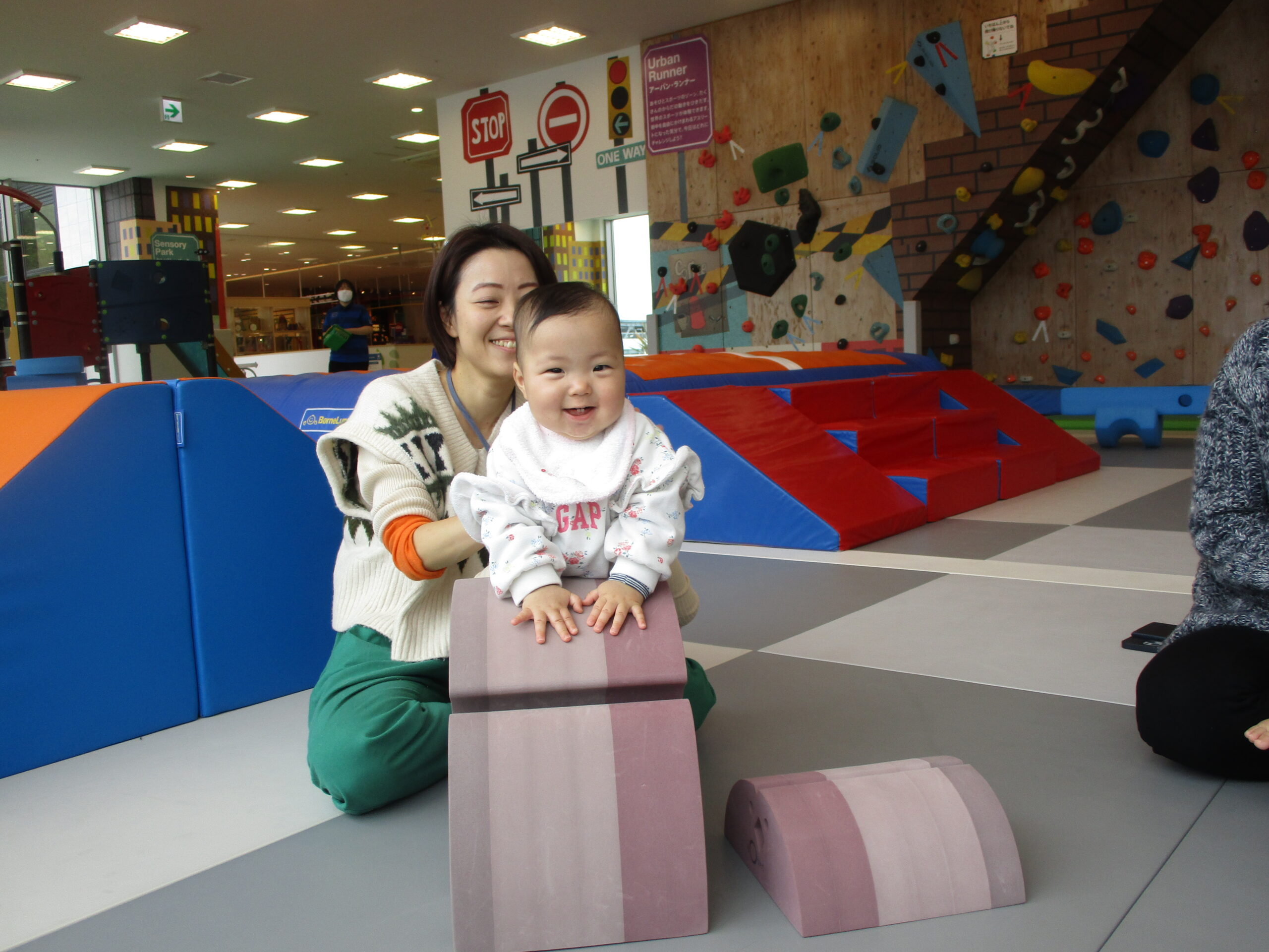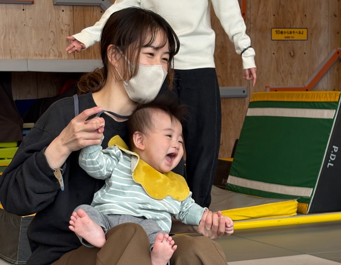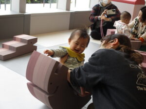 親子でチキンのボブルスに座って「むすんでひらいて」