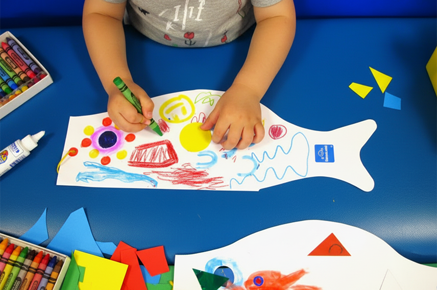 A2サイズの大きな鯉のひらきに、ステッカーや折り紙、ポンポンマーカーでたくさんうろこをコラージュ。