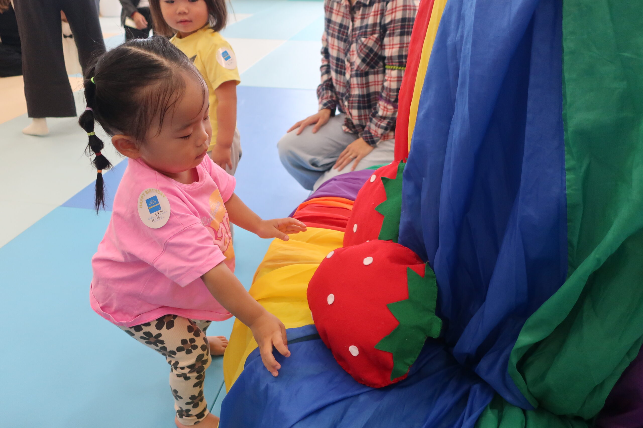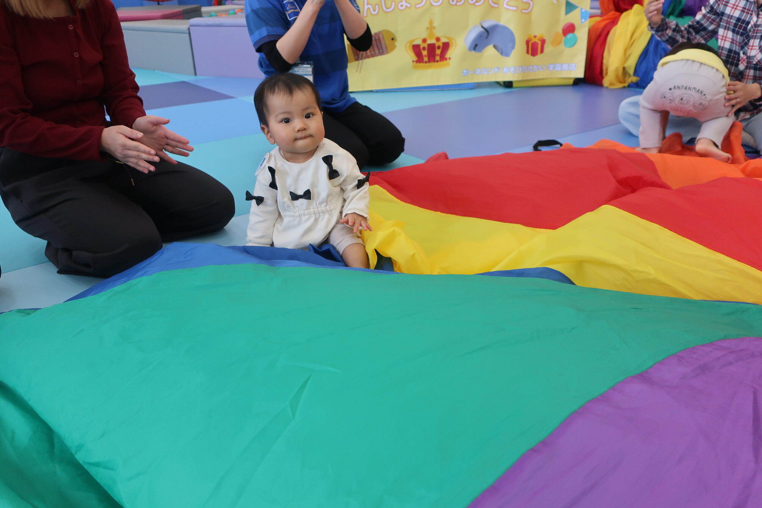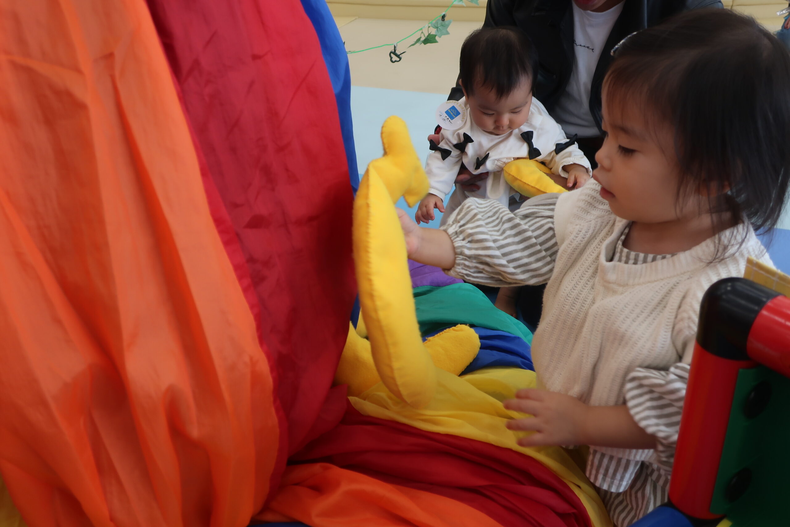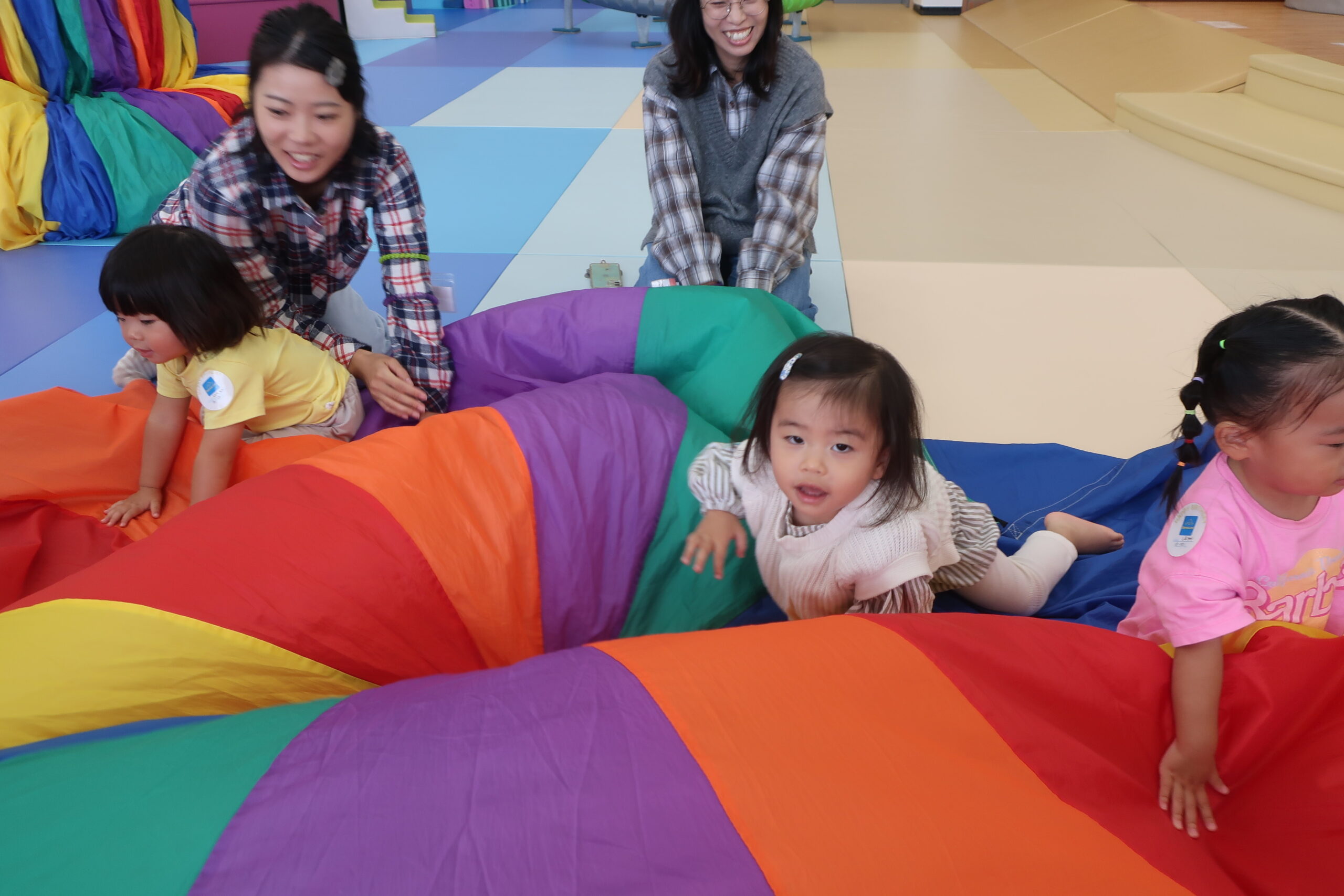 まずはみんなでカラフルな布のパラシュートであそびました。