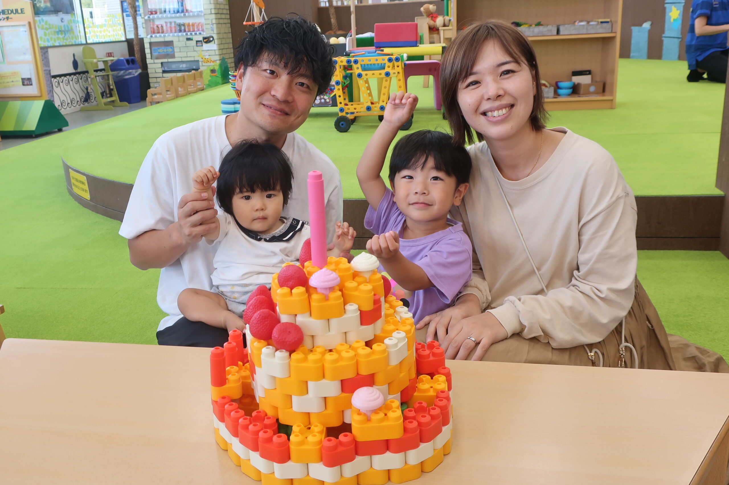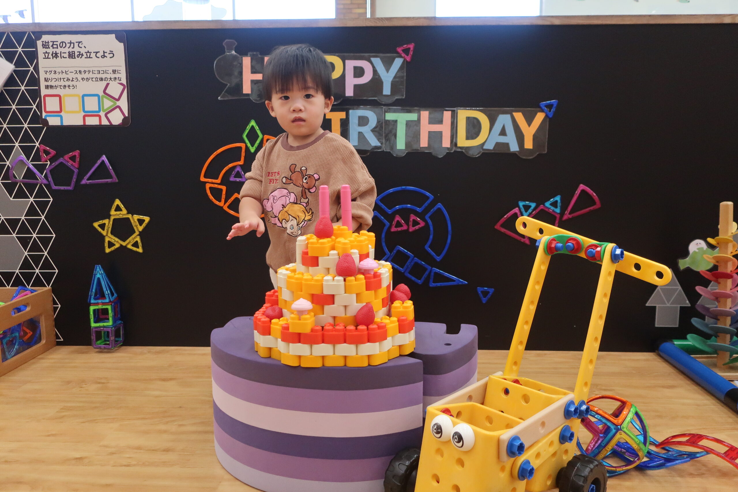 テクニコで作った手押し車がお気に入りで一緒に写真を撮りました!フルーツの飾りつけも楽しそうでしたよ。