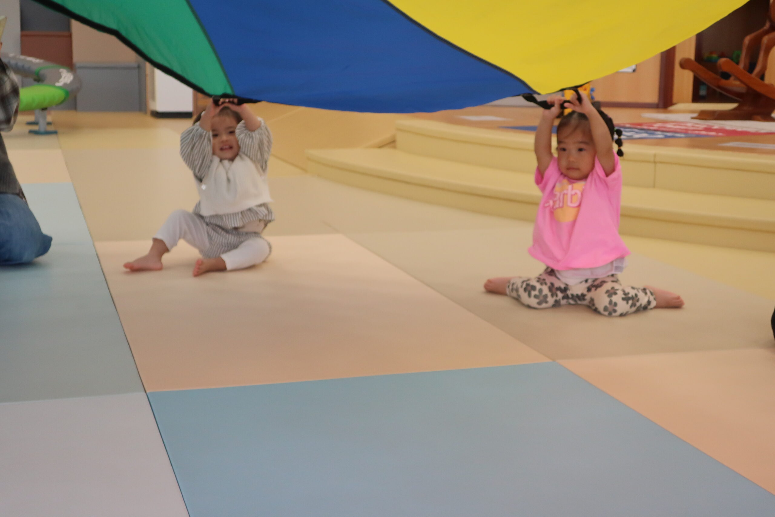 まずはみんなでカラフルな布のパラシュートであそびました。
