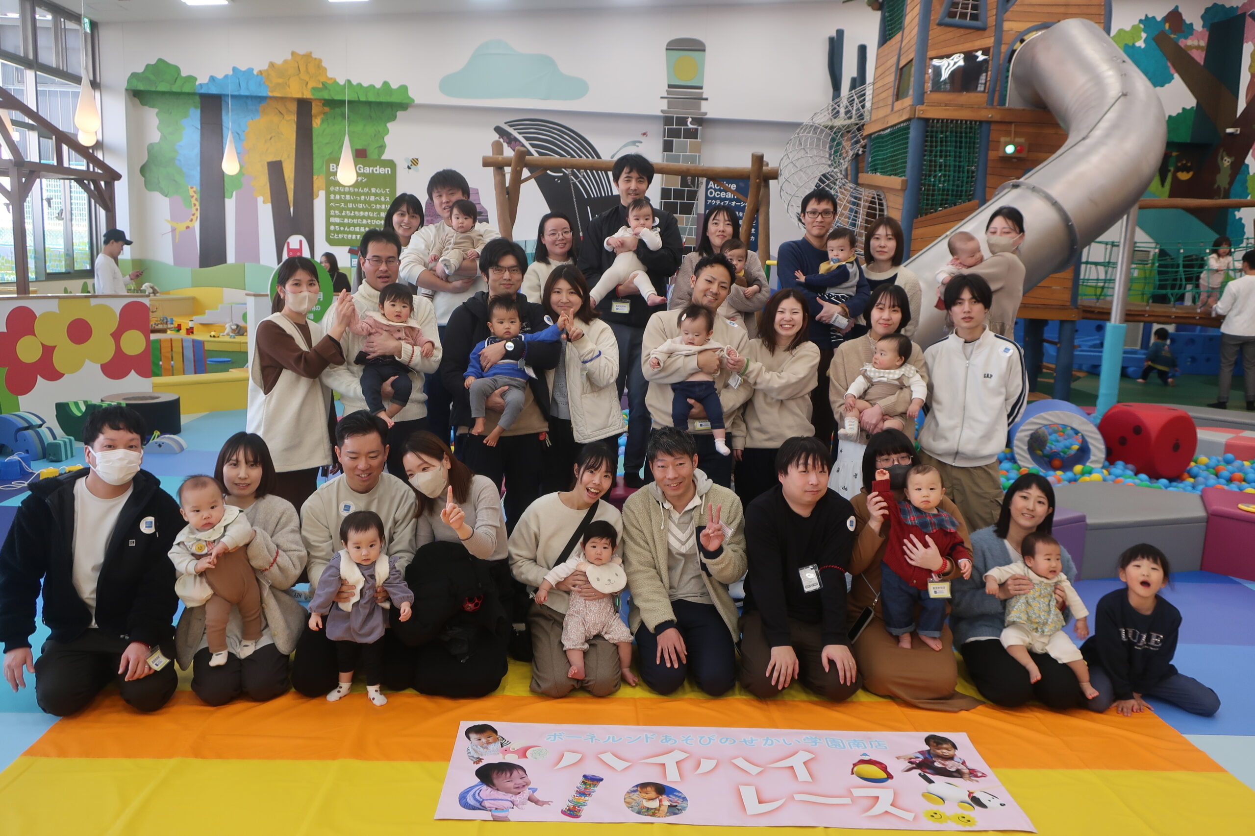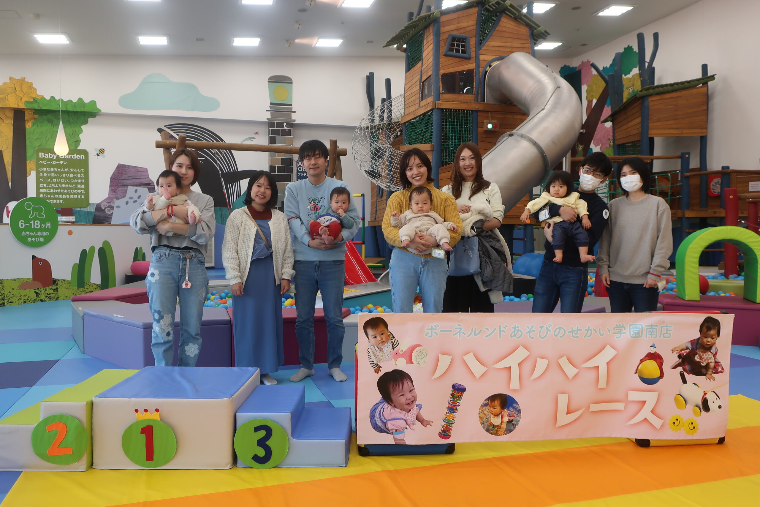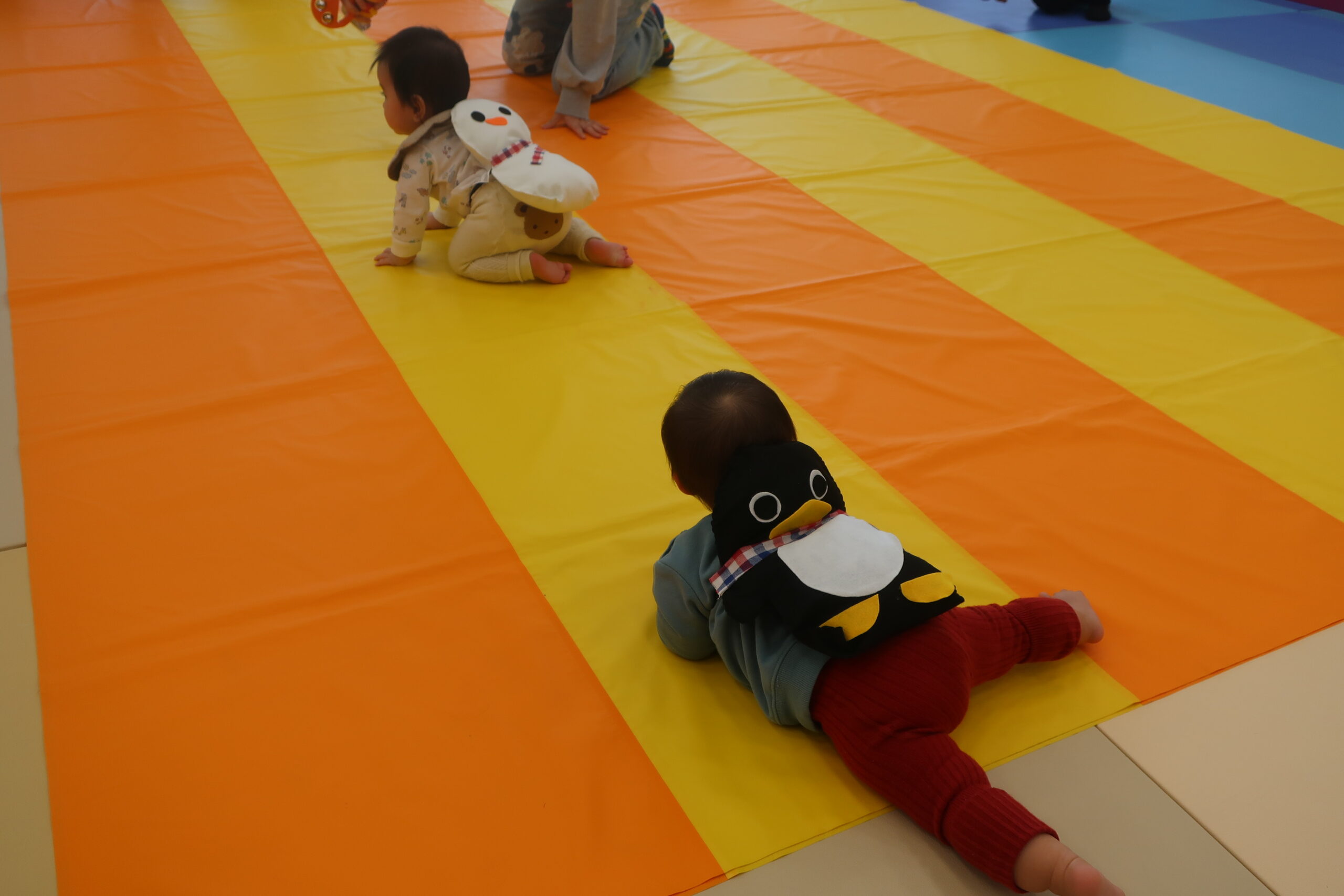この日はゆきだるまやペンギンを背中につけてハイハイレースを行いました!