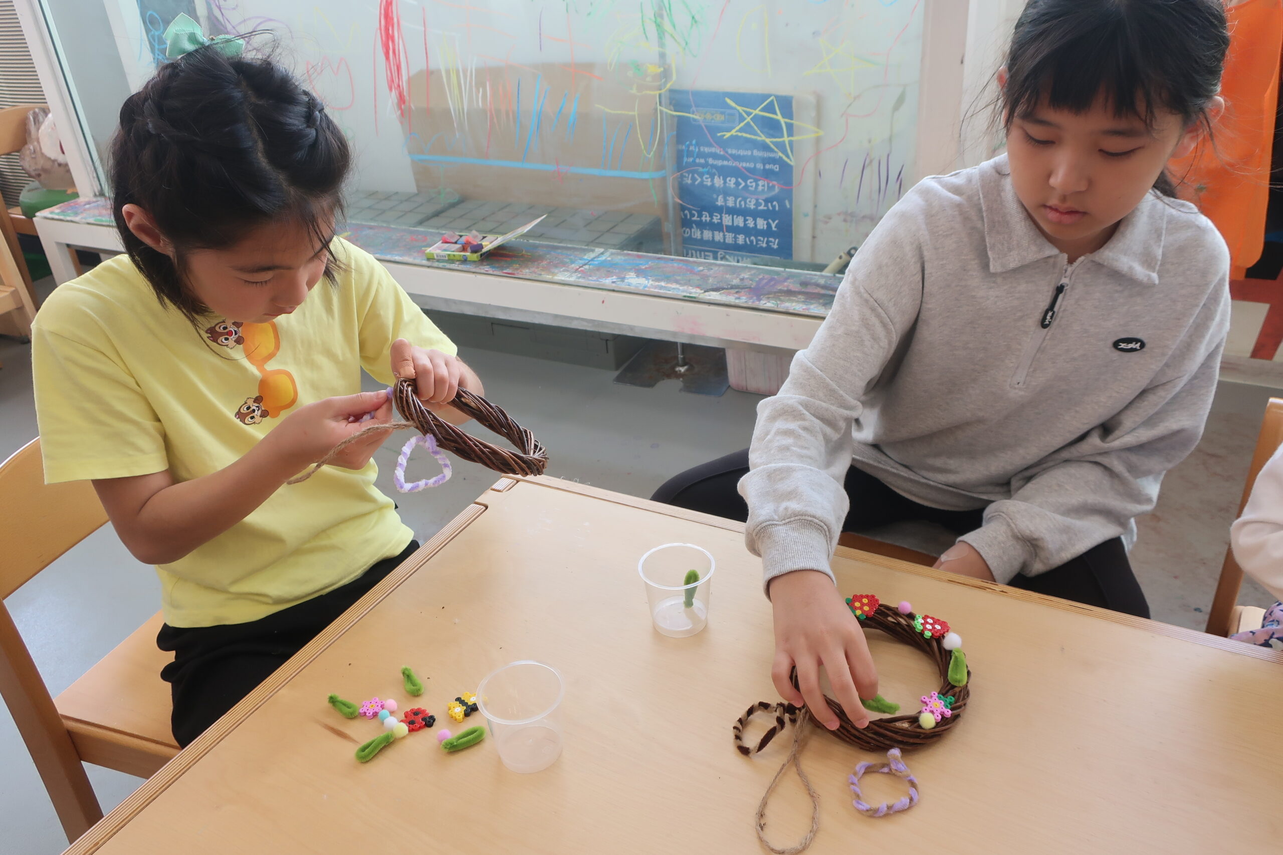 色をつけたお花やアイロンでくっつくハマビーズで作った春のモチーフをリースにつけていきます。
