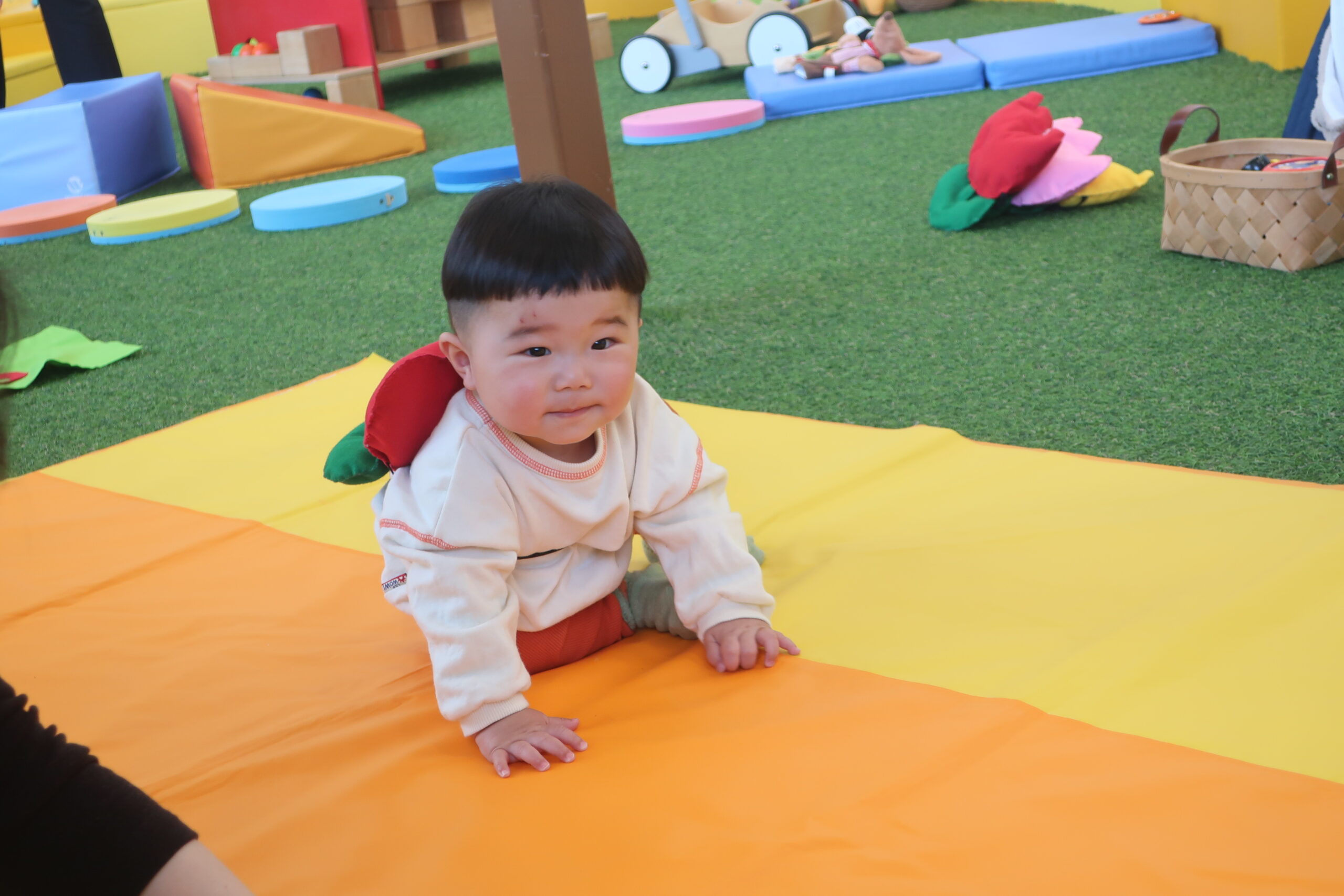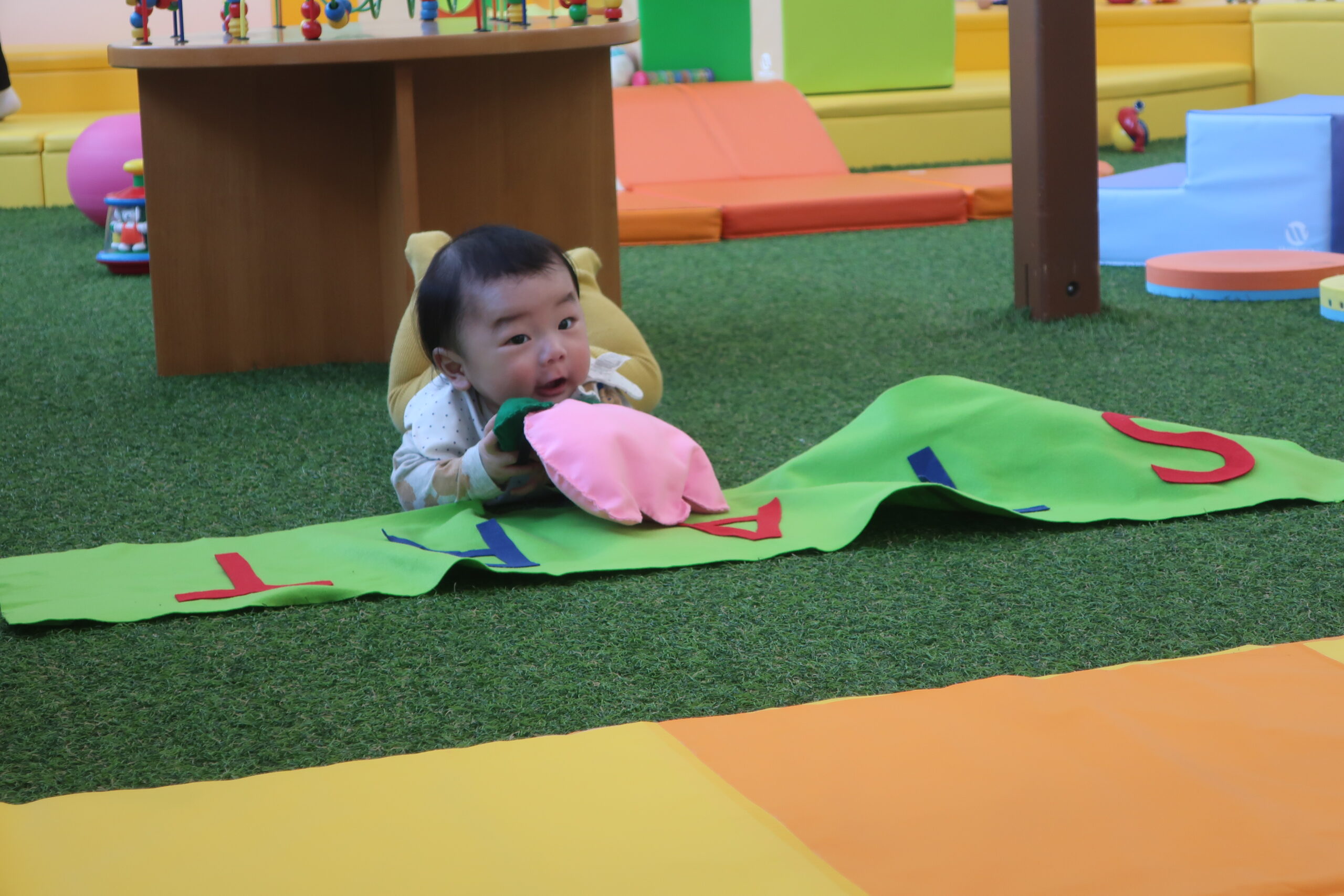 3/16・3/28は赤や黄色のチューリップを背中につけてハイハイをしました。