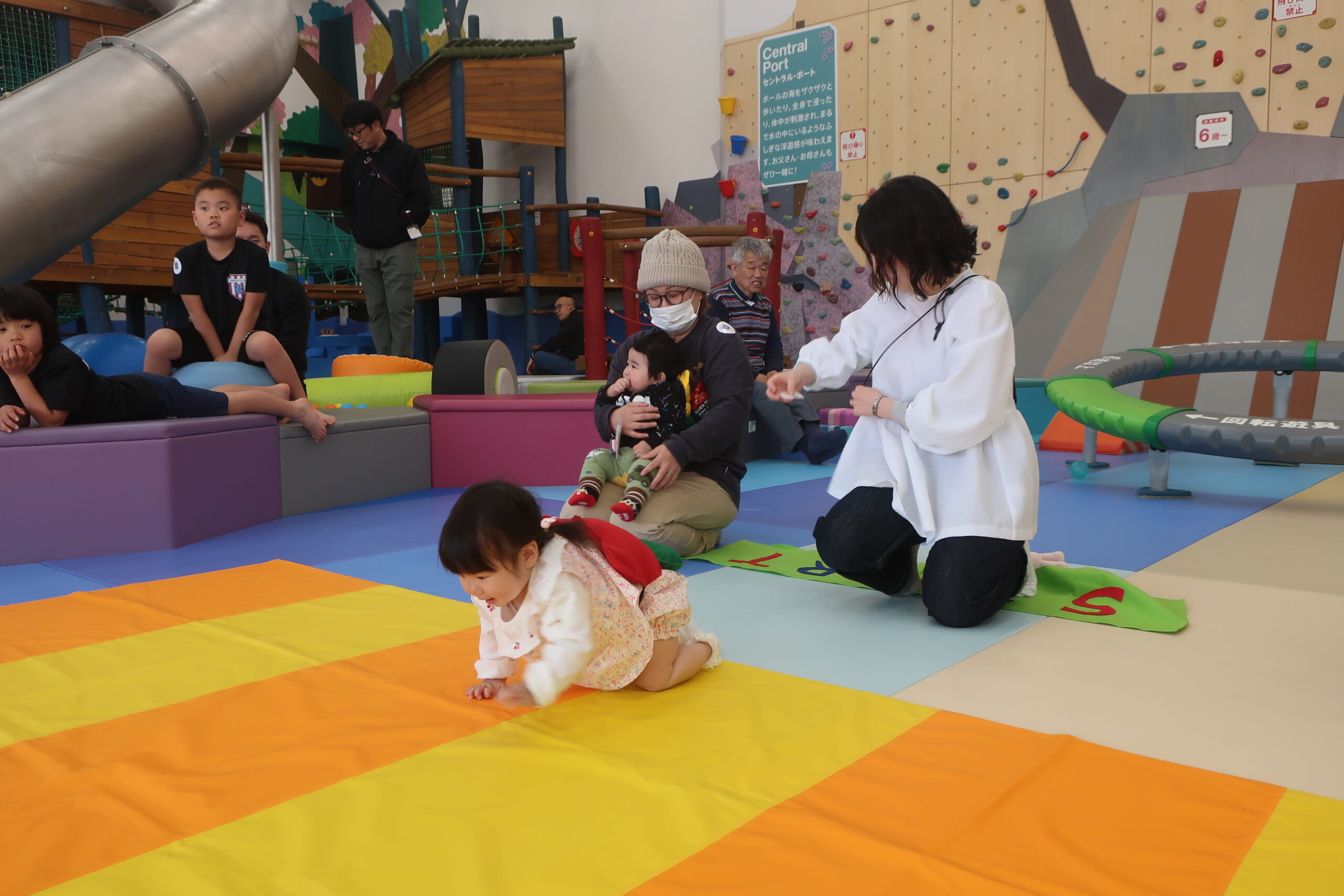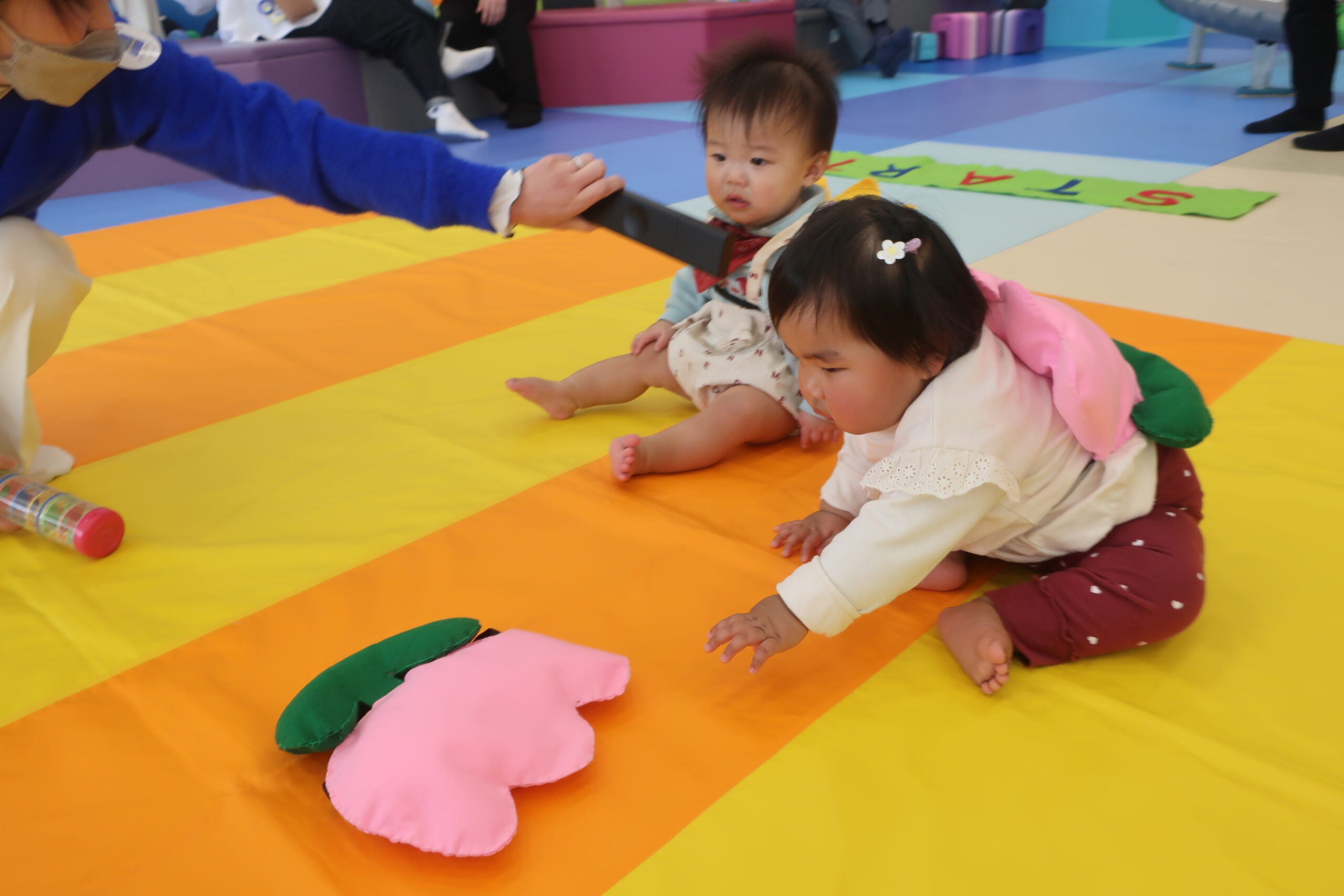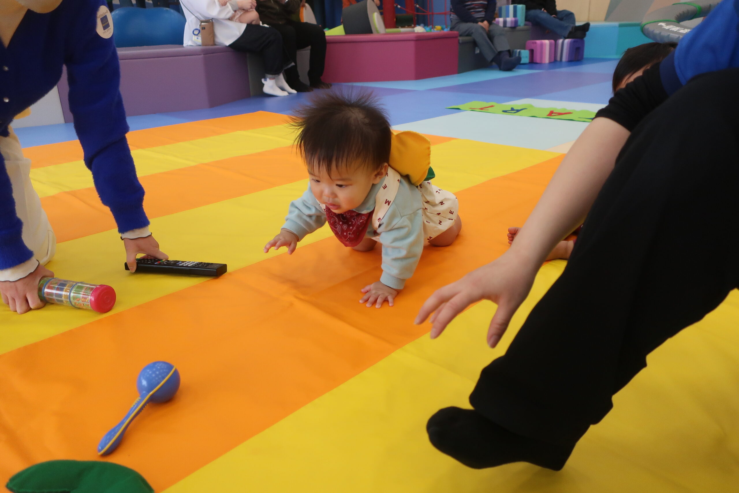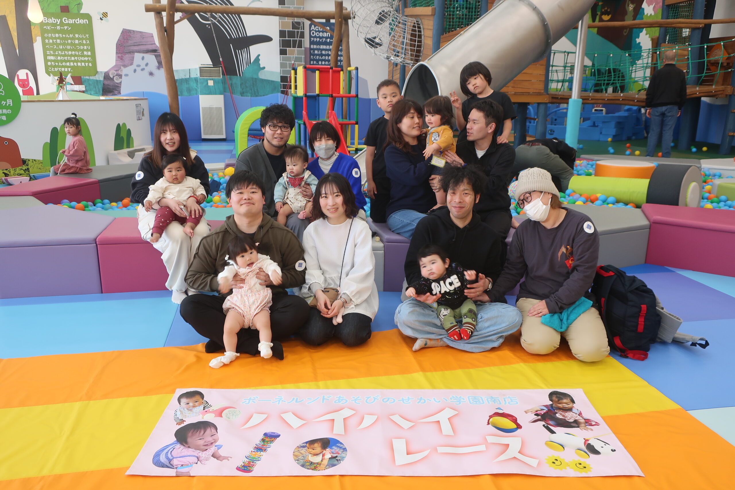 初めての場所にちょっぴりドキドキしてしまう赤ちゃん、ニコニコでゴールまでハイハイする赤ちゃんなど様々な表情が見られました。