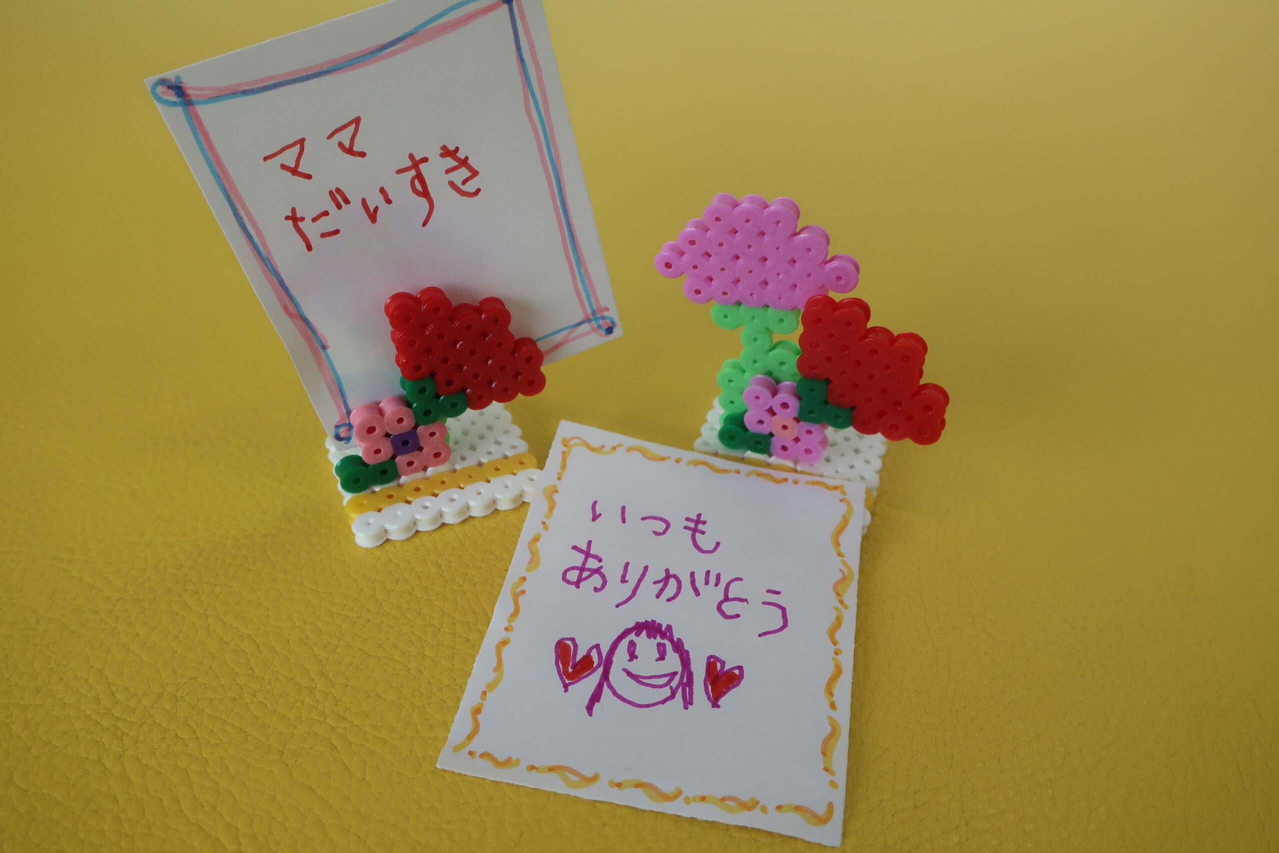 アイロンでくっつくハマビーズで母の日のプレゼントづくりをしませんか?できあがったカーネーションはメモスタンドにもなるので、メッセージと一緒に飾ることもできますよ!
