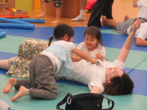 まずは手遊び!パラバルーンで「むすんでひらいて」や「ばすにのって」「まほうののり」をしました♪