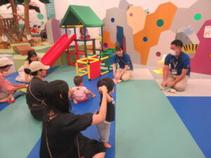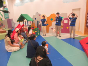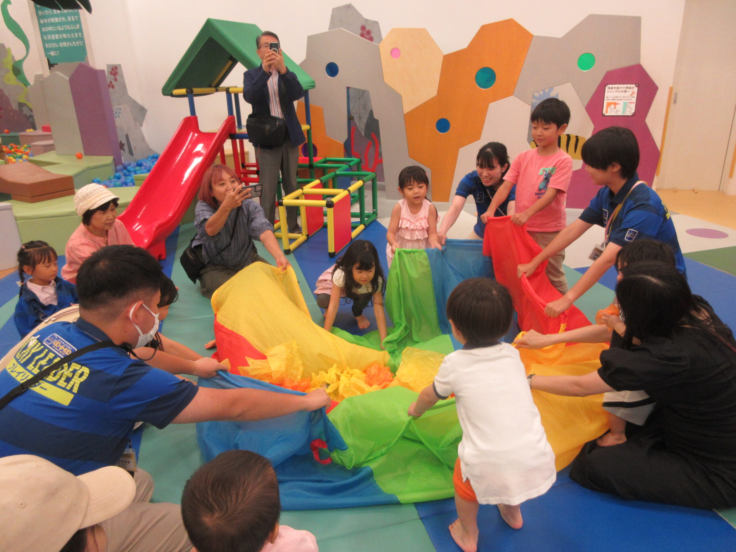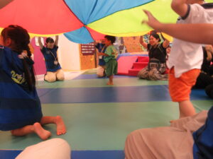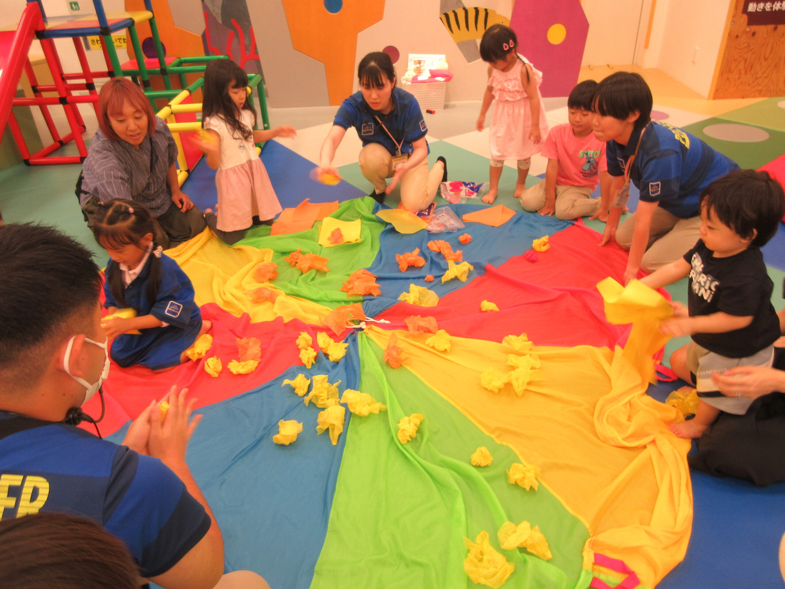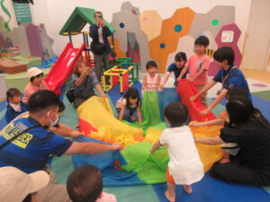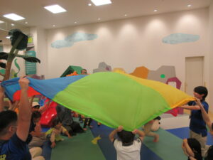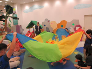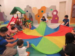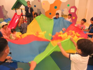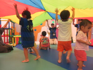 サプライズイベント カテゴリー:イベント報告 2025年09月25日 みなさん、こんにちは! プレイリーダーのえみおねえさんです! 今回は、9月25日(木)に行われた 「サプライズイベント」のご報告をいたします♪ まずは準備運動で「大きな栗の木の下で🌰」やりました♪ そして、いよいよメインの「サプライズイベント」!!!! 今回は、パラバルーンをおこないました。 パラバルーンを大波小波~ばんざーい🙌 パラバルーンの上に花紙をのせて、「むすんでひらいて」をうたったよ🎵 最後は、「ハンバーグを作ろう」をみんなでやりました。 とっても上手にできたねー!! ご参加ありがとうございました!