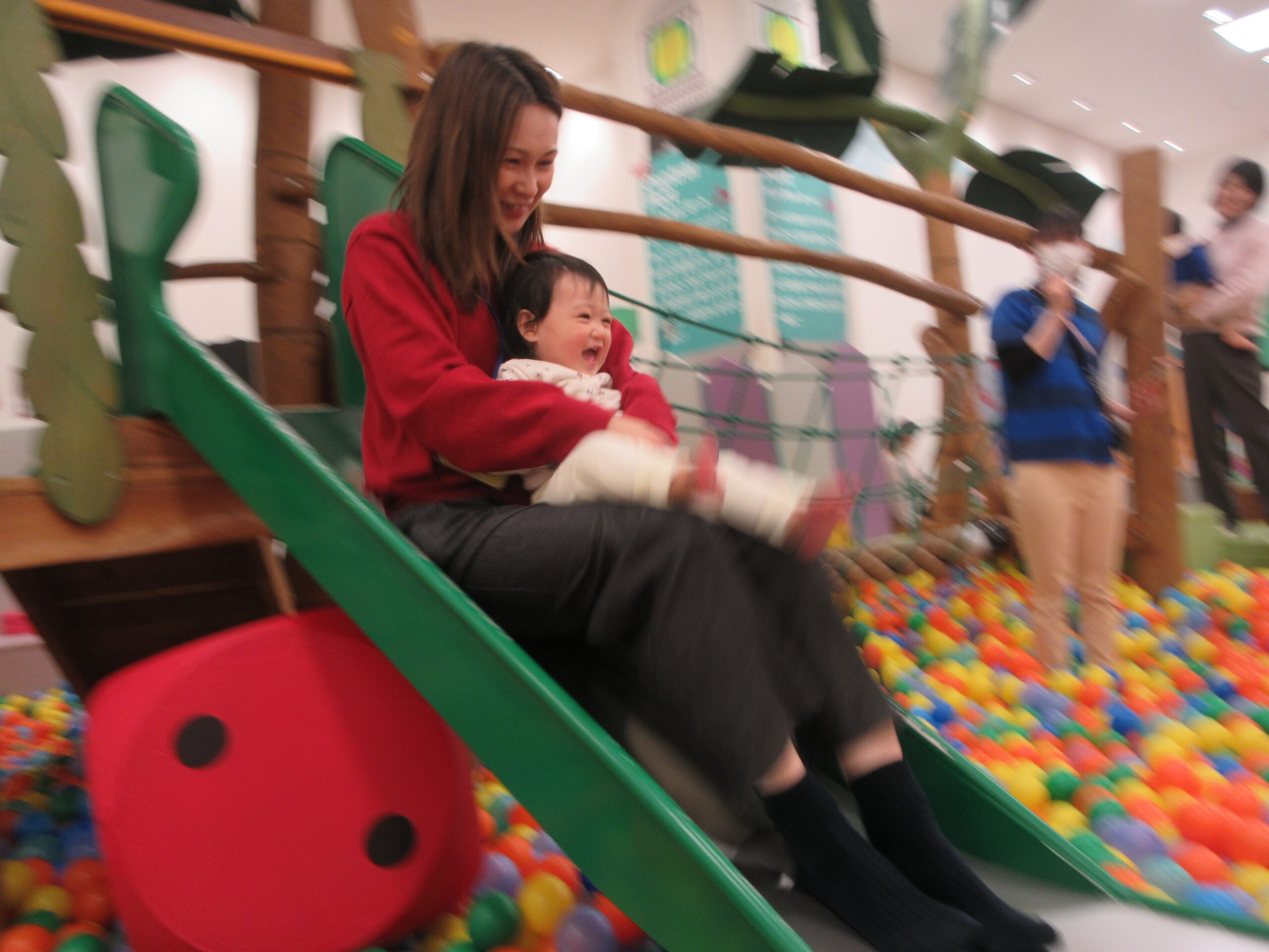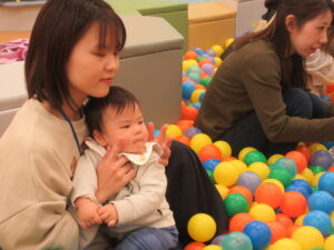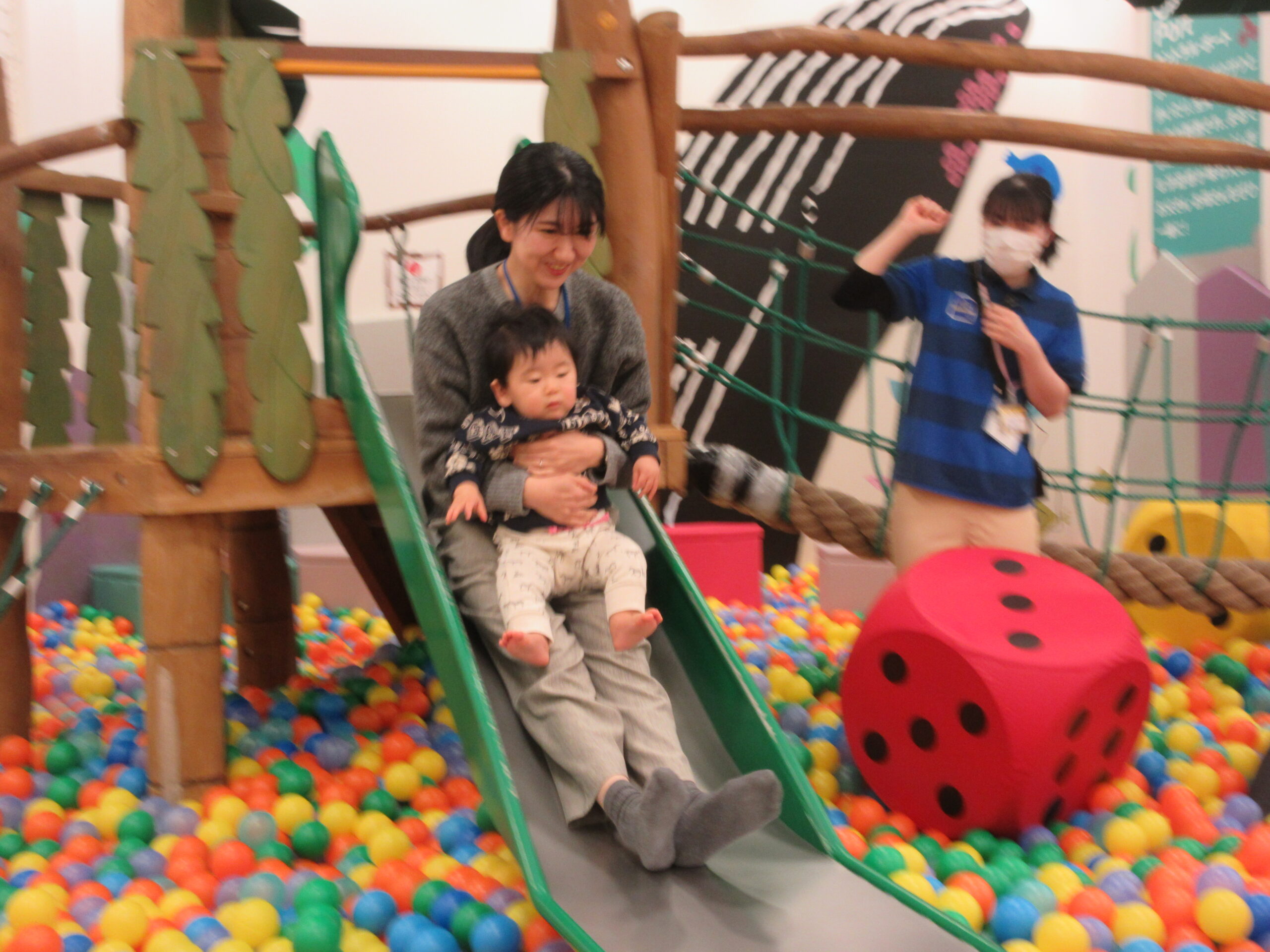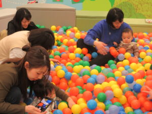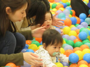 まずはボールプールに入って「ミックスジュース」の手遊びをして、すべり台を楽しんだりしました🔴🔵