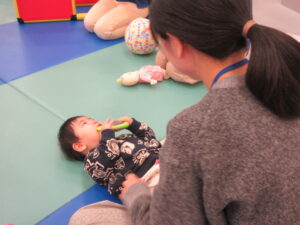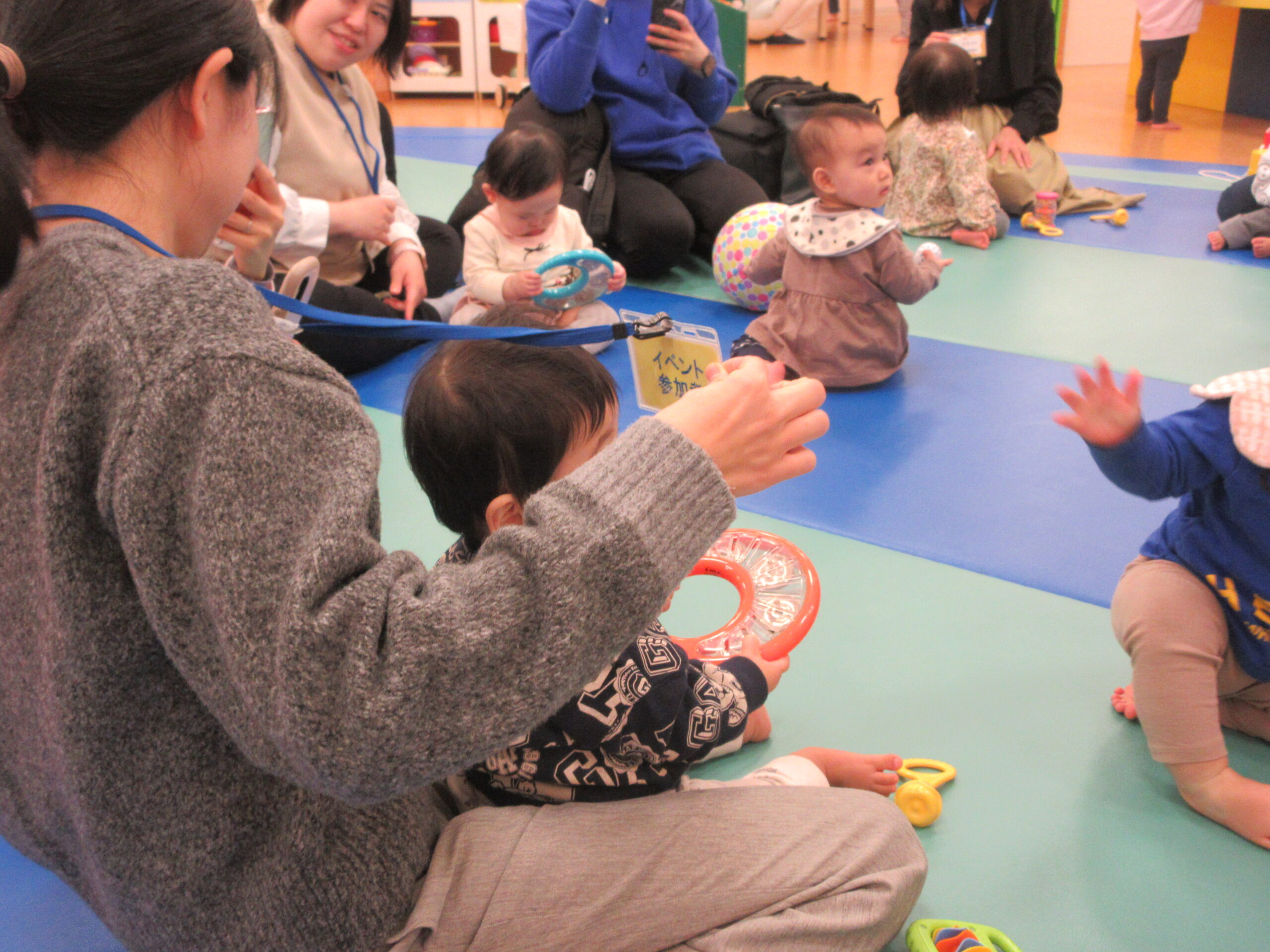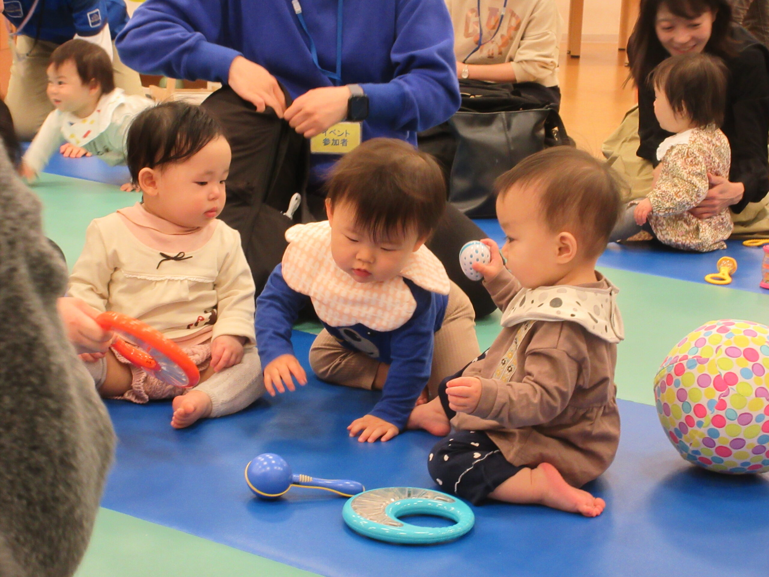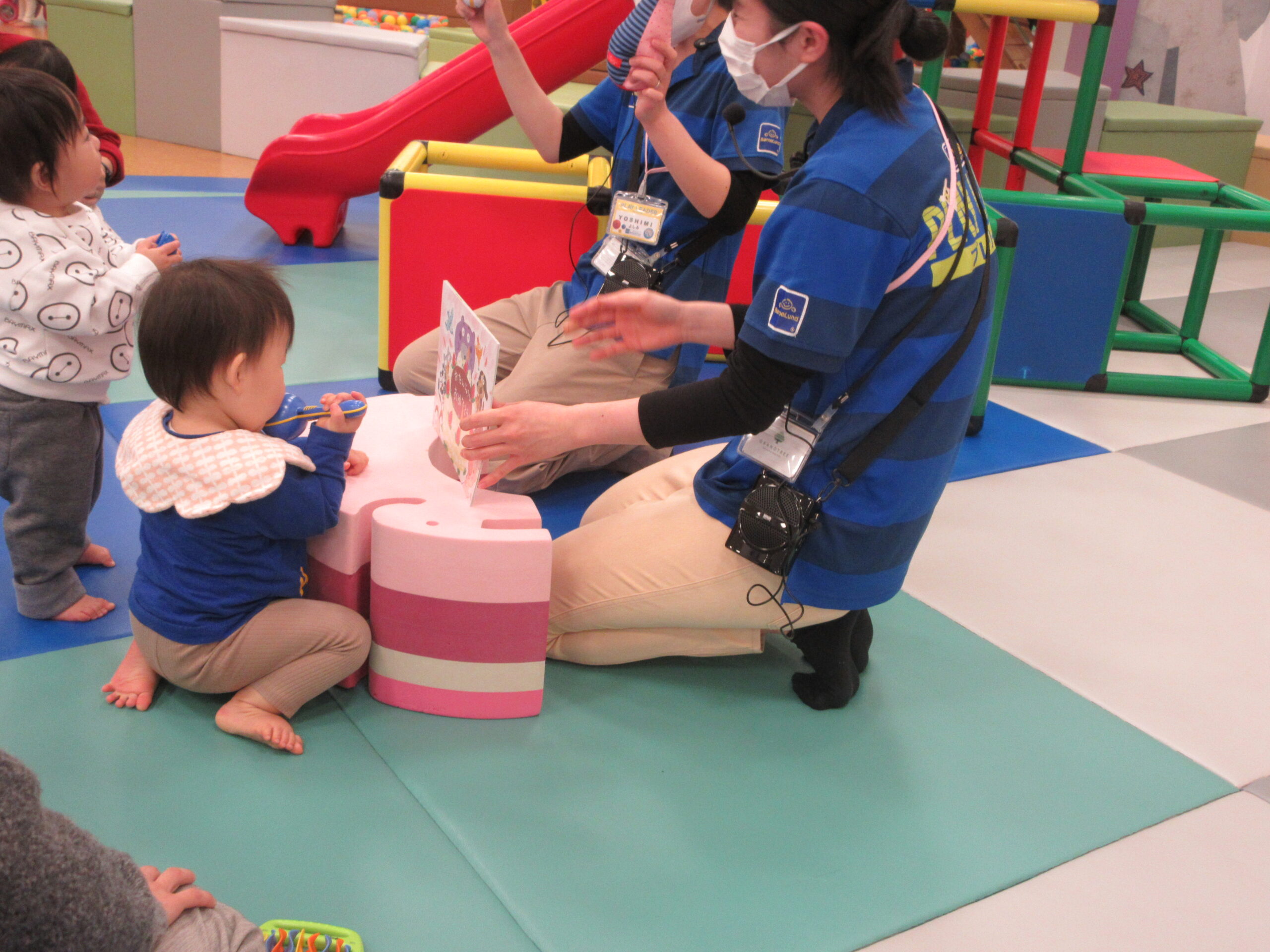 まずはボールプールに入って「ミックスジュース」の手遊びをして、すべり台を楽しんだりしました🔴🔵