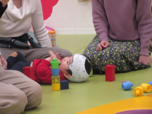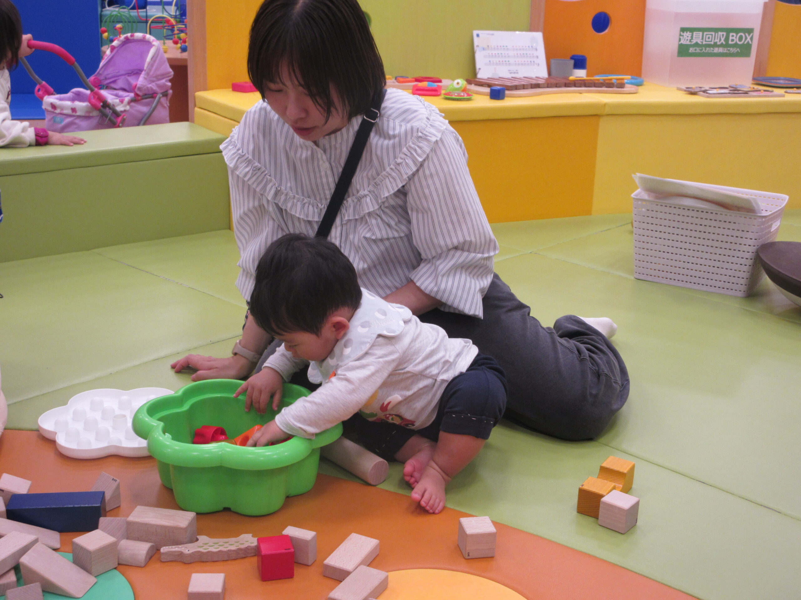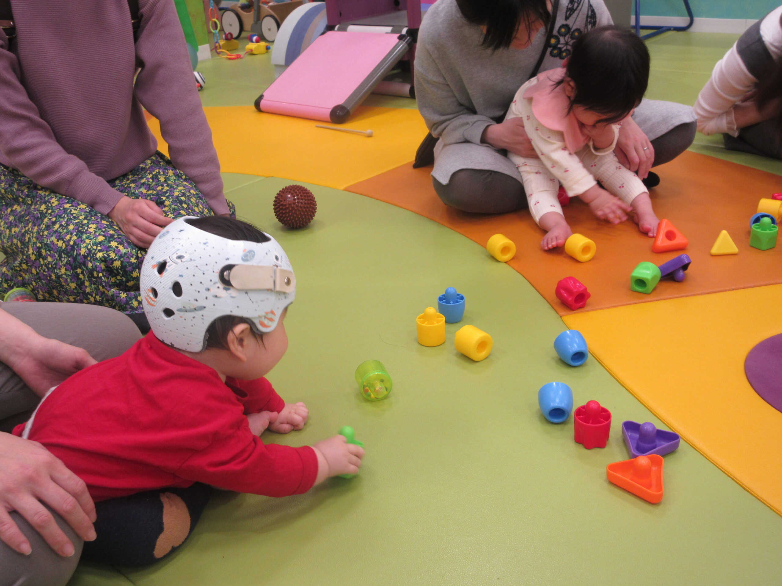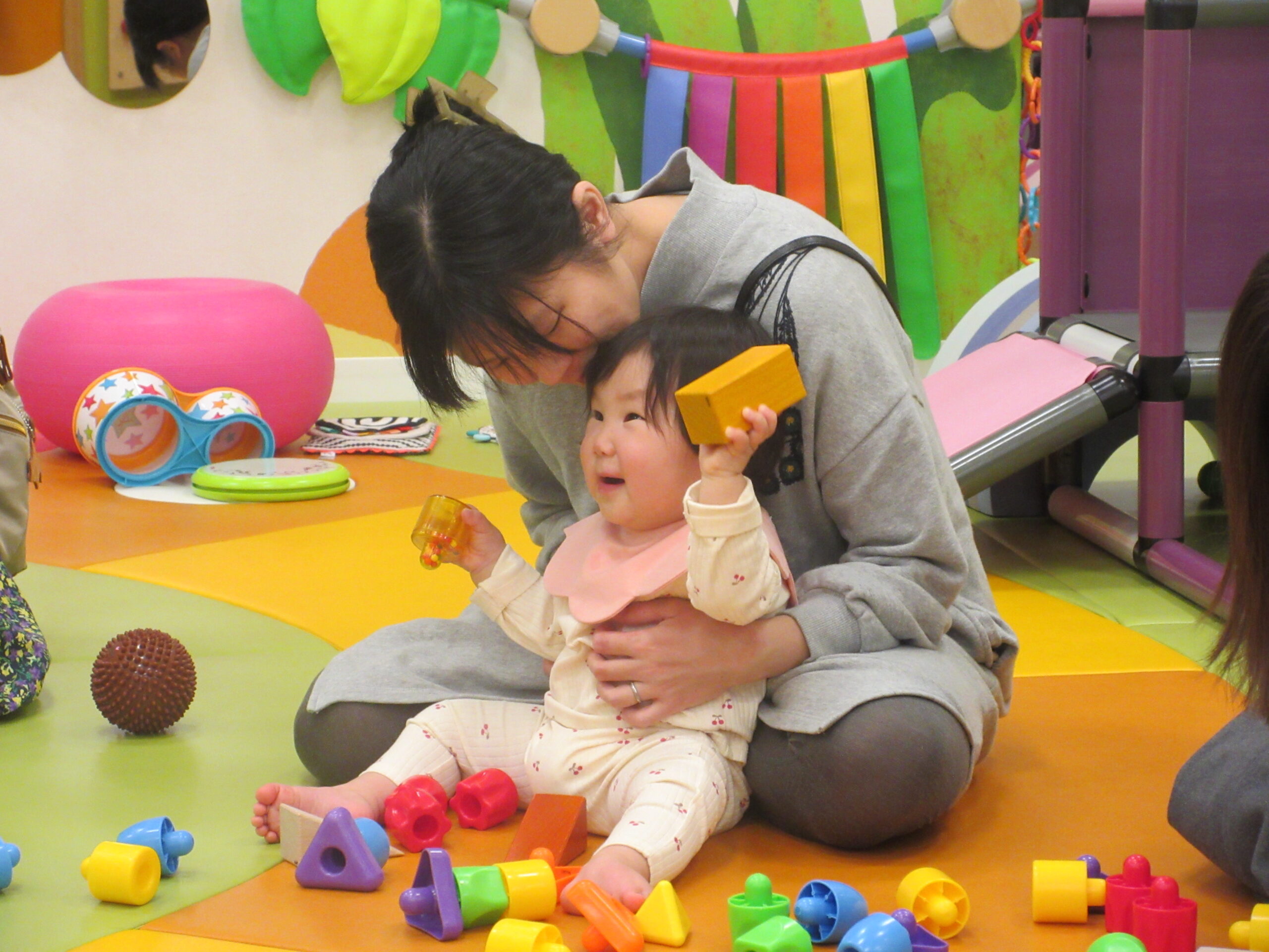 まずは触ってもらってから、「どんな色がすき」のお歌をうたいながら、すきな色のブロックを選んでもらったよ!!