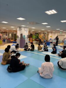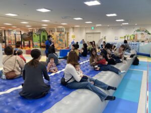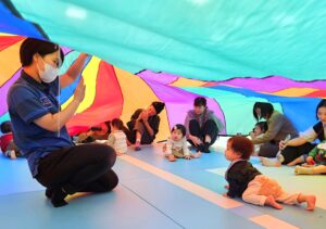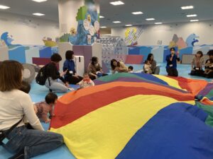 エアトラック体験をしたり、大きな布を使ってあそんだり、沢山お子様とふれあい遊びをしたり