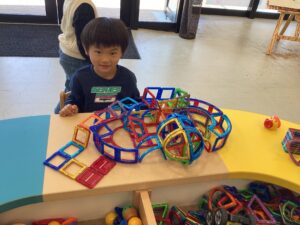 マグフォーマーで線路を作っていた男の子。