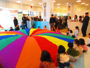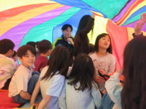 カラフルな大きな布のパラシュートを使って、