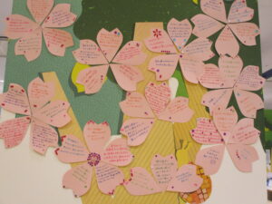 今日キドキドにあそびに来た「ワケ」を桜の花びらに書いて