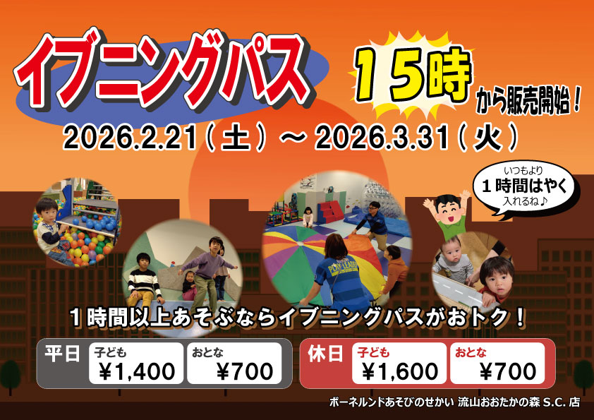 ★イブニングパスキャンペーンのお知らせ★ カテゴリー:未分類 2026年02月15日 みなさん、こんにちは! ボーネルンドあそびのせかい 流山おおたかの森S.C.店では 2026/2/21(土)~2026/3/31(火)の期間中、 イブニングパスのお得なキャンペーンを開催します★ 夕方からお得にたっぷり遊ぼう!! みなさまのご来店をスタッフ一同お待ちしております。
