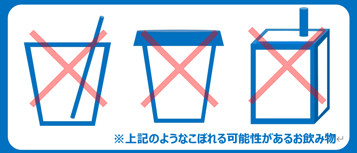 A.現在、飴やガム・離乳食を含めて、お食事は全てご遠慮頂いております。お飲み物は飲んで頂けますが、持ち込みが必ず、ペットボトルや水筒の、蓋で密閉できるものをお願いしています。