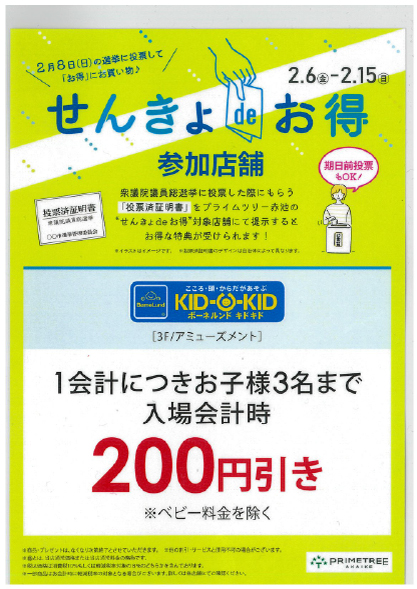 おかしプレゼントキャンペーン カテゴリー:未分類 2026年02月5日 みなさん、こんにちは! キドキド赤池店では、2/6(金)~2/15(日)まで、参議院選挙に投票した際にもらう「投票済証明書」をご提示いただくと最大お子様3名様まで200円割引のサービスを行います。 選挙当日は、ご家族で過ごされる機会となる方も多いと思われます。 是非、投票後にキドキドでご家族で遊んで楽しい思い出を作りましょう。 ご来店お待ちしております。