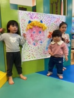 今回は手型で沢山ぺたぺたしましたよ。最後に鬼の髪の毛や目、鼻をつけて完成です!