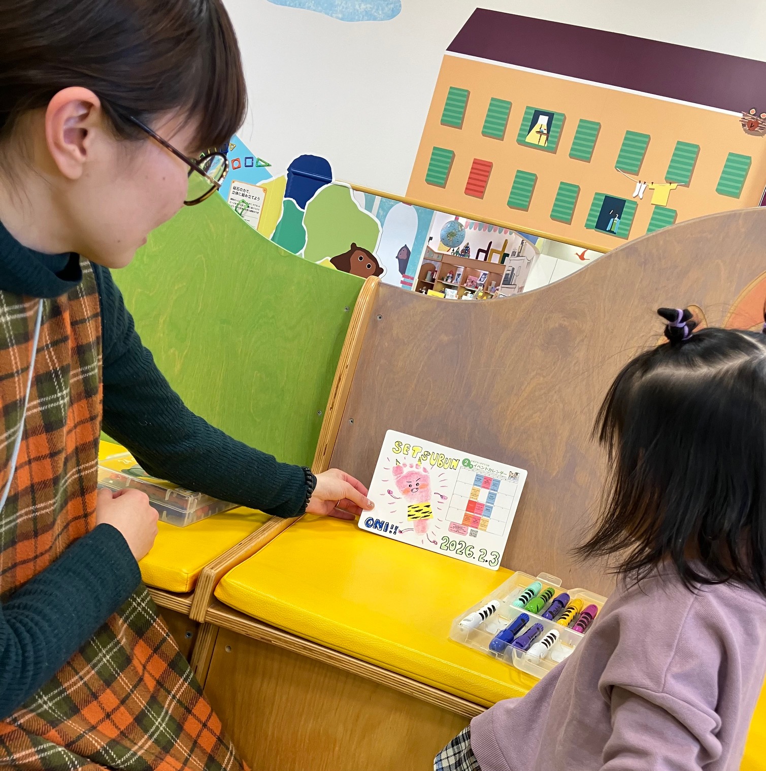 2月3日に行ったベビーイベント。こちらは足型スタンプで節分にちなんで鬼を作りました!